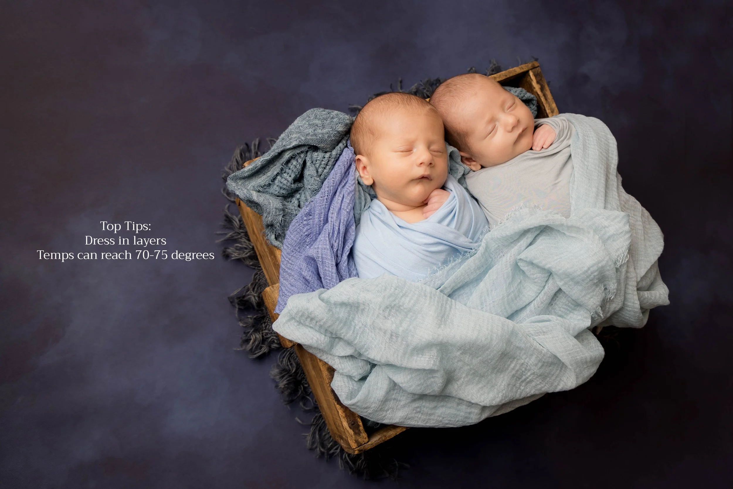Finally, in the the best interests of the baby the temperature of the room will fluctuate and can go up to 70-75 degree when baby is undressed; so you may get a little toasty - please dress in layers. It is set to this temperature as baby will mainly be in the nude for the session and is used to being warm and tight space before birth so this helps keep them happy, calm and sleepy.